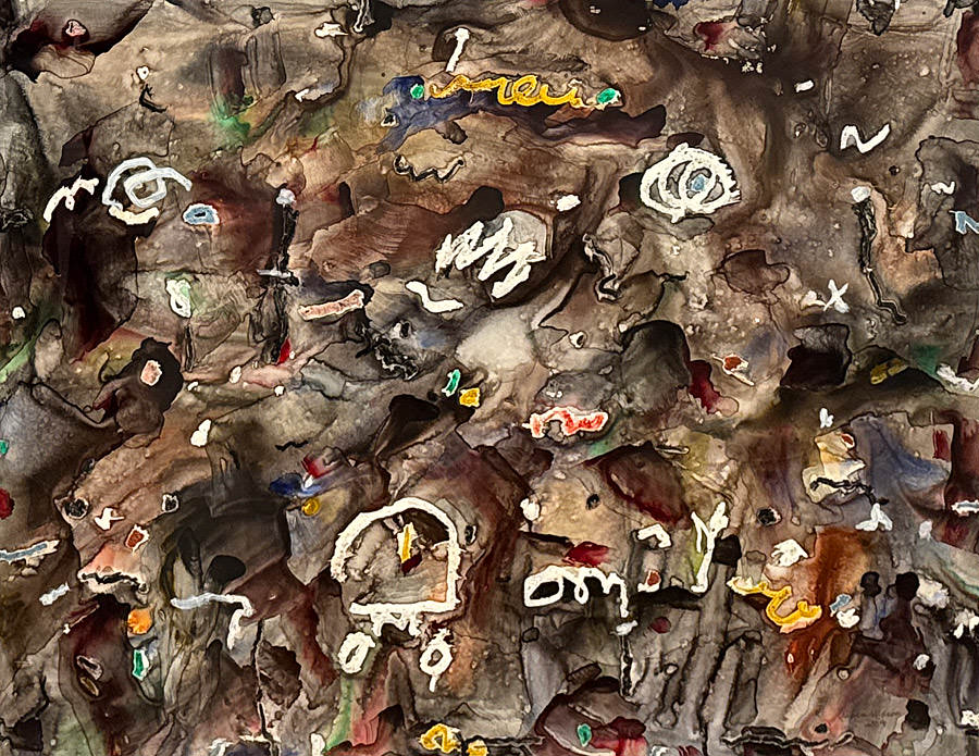 Mason was forced to stop using oil paints due to the blinding headaches brought on by their fumes. It was at this time that Mason began using his squeeze bottles of acrylic paints. He says he likes working with squeeze bottles because it’s like the paint is an extension of his arm and they enable him to create long, fluid lines without having to stop due to a dried-up brush.